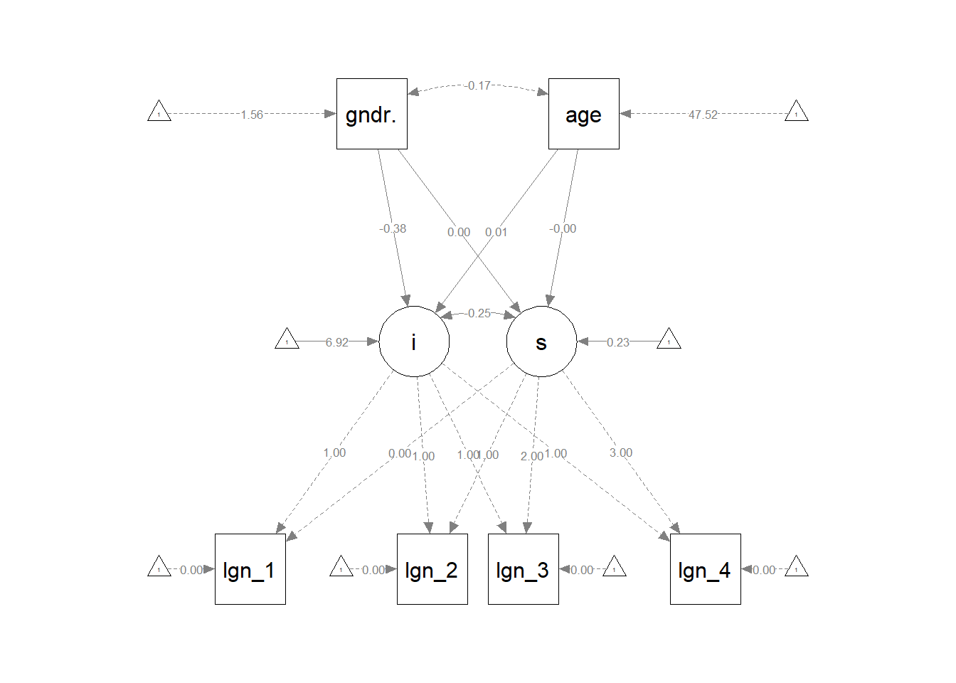 ## lhs op rhs est se z pvalue ci.lower ci.upper ## 1 i =~ logincome_1 1.000 0.000 NA NA 1.000 1.000 ## 2 i =~ logincome_2 1.000 0.000 NA NA 1.000 1.000 ## 3 i =~ logincome_3 1.000 0.000 NA NA 1.000 1.000 ## 4 i =~ logincome_4 1.000 0.000 NA NA 1.000 1.000 ## 5 s =~ logincome_1 0.000 0.000 NA NA 0.000 0.000 ## 6 s =~ logincome_2 1.000 0.000 NA NA 1.000 1.000 ## 7 s =~ logincome_3 2.000 0.000 NA NA 2.000 2.000 ## 8 s =~ logincome_4 3.000 0.000 NA NA 3.000 3.000 ## 9 i ~ gndr.fct -0.380 0.017 -22.944 0.000 -0.412 -0.347 ## 10 i ~ age 0.010 0.000 20.761 0.000 0.009 0.011 ## 11 s ~ gndr.fct 0.001 0.006 0.166 0.868 -0.010 0.012 ## 12 s ~ age -0.003 0.000 -18.949 0.000 -0.003 -0.003 ## 13 logincome_1 ~~ logincome_1 0.505 0.011 45.998 0.000 0.483 0.526 ## 14 logincome_2 ~~ logincome_2 0.732 0.008 88.993 0.000 0.716 0.748 ## 15 logincome_3 ~~ logincome_3 0.703 0.008 92.653 0.000 0.688 0.718 ## 16 logincome_4 ~~ logincome_4 0.573 0.010 58.180 0.000 0.554 0.593 ## 17 i ~~ i 1.412 0.017 84.015 0.000 1.379 1.445 ## 18 s ~~ s 0.090 0.002 38.548 0.000 0.085 0.094 ## 19 i ~~ s -0.245 0.005 -46.828 0.000 -0.255 -0.235 ## 20 gndr.fct ~~ gndr.fct 0.246 0.000 NA NA 0.246 0.246 ## 21 gndr.fct ~~ age -0.172 0.000 NA NA -0.172 -0.172 ## 22 age ~~ age 297.013 0.000 NA NA 297.013 297.013 ## 23 logincome_1 ~1 0.000 0.000 NA NA 0.000 0.000 ## 24 logincome_2 ~1 0.000 0.000 NA NA 0.000 0.000 ## 25 logincome_3 ~1 0.000 0.000 NA NA 0.000 0.000 ## 26 logincome_4 ~1 0.000 0.000 NA NA 0.000 0.000 ## 27 gndr.fct ~1 1.559 0.000 NA NA 1.559 1.559 ## 28 age ~1 47.520 0.000 NA NA 47.520 47.520 ## 29 i ~1 6.916 0.036 194.030 0.000 6.846 6.986 ## 30 s ~1 0.230 0.012 19.332 0.000 0.207 0.253